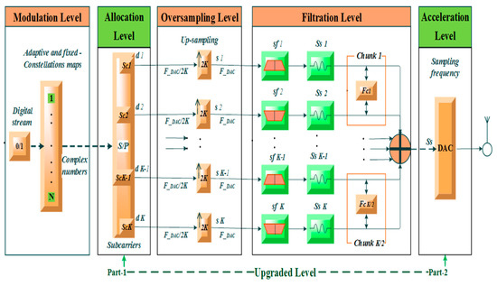 At the acceleration level where the second part of upgrading is applied, the promoted FDAC size is utilized to mitigate the impact of system expansion where doubled subcarriers participate in the same resource space. Hence, to avoid sharing limitations, the BW size is amended herein to be compatible with the developed system requirements. Accordingly, the FDAC limit should be expanded to keep supplying a high level of bit-rate for each utilized subcarrier. The output of this operation is an analog signal that is ready for transmission by a suitable antenna.