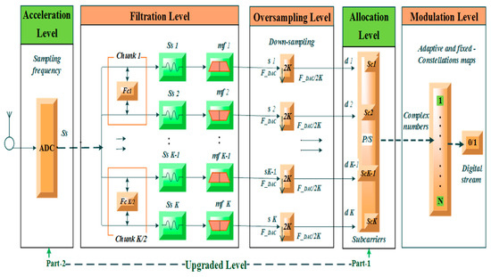As is seen in Figure 2, on the receiver side of the multi-carrier OGFDM system where the wireless signal is recognized, inverse processes are performed to recover the originally transmitted data. At the acceleration level (the second part of upgrading), the promoted analog-to-digital converter (ADC) is used to convert the analog signal to the digital domain. Then, at the filtration level, the doubled set of the matching filters are employed to extract each intended subcarrier of every elected fc. After the de-multiplexing process, the convoluted subcarriers are transferred to the oversampling level where each utilized frequency subcarrier is down-sampled by K or 2K according to the oversampling factor of the transmitter. At the allocation level (the first part of upgrading), the doubled set of the complex numbers that belong to the down-sampled subcarriers are gathered in one stream. At the modulation level, where diffident shapes of modulation are applied, the complex numbers of the frequency subcarriers are converted dynamically into a stream of binary digits.