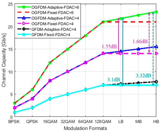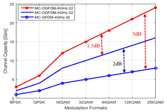As is seen in Figure 6, in this experiment, a stable 2 dB gain is obtained between the aggregated channel capacity of the OGFDM and the GFDM because of the orthogonality impact of the utilized Hilbert filters on the OGFDM waveform. Thus, a higher channel capacity (double) is achieved with the orthogonal OGFDM than the non-orthogonal GFDM with that root-raised-cosine (RRC) for an equivalent level of the sampling frequency. In addition, because of expanding the applied FDAC, 3 dB improvement can be achieved between the OGFDM and the GFDM. The main reason beyond this increment is the combined influence of both the advanced Hilbert filters and the improved sampling frequency. As such, the high channel capacity can be acquired by either improving the BW efficiency (Hilbert pair) or by extra extending the used sampling frequency.