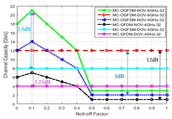 As is shown in Figure 7, the experimental work indicates that by utilizing the DOV with the upgraded OGFDM at worst transmission states (0.5 ≤ α ≤ 1), the channel capacity is extremely improved. Thus, 6 dB and 12 dB gains are obtained for the channel capacity of the extended OGFDM with the DOV higher than the conventional OGFDM and GFDM with the NOV.