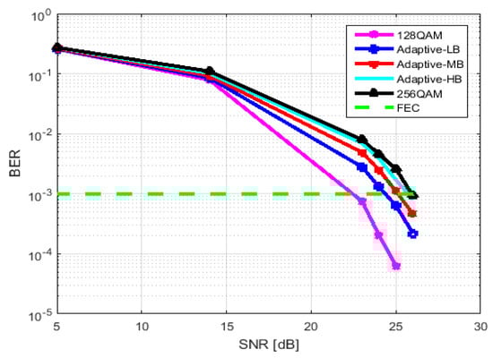 Three significant adaptive areas for the OGFDM, low boost (LB), medium boost (MB), and high boost (HB) between two sequential fixed modulation schemes (128 and 256 QAM).