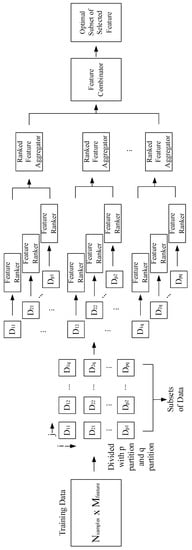 Firstly, the training data were partitioned into several subsets. Then, feature selection was performed on each subset of the data. The results of feature selection and feature ranking were then aggregated to get several new subsets of selected features. Subsets of selected features were then combined to get the most optimal feature subset. Guyon and Elisseeff [1] showed that selecting a subset of features is more useful for excluding redundant features than selecting the most relevant feature. Figure 4 shows a detailed illustration of the proposed framework.