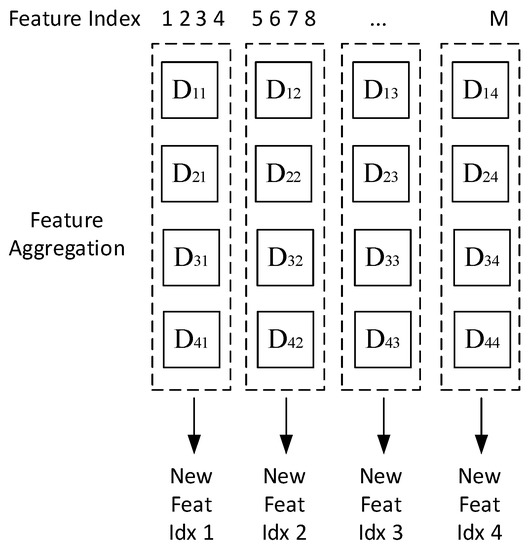As illustrated in Figure 5, a group of new features “New.Feat.Idxj” was obtained by finding the mode value of the feature in each subset D in the i row and j column. Equation (7) shows how the feature aggregation works.