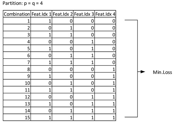 In our previous research [32], a combination was done by combining all features in each subset. Apparently, combining all subsets of features does not produce the best performance. Thus, to solve this problem, we looked for min.loss from all possible combinations of the subsets of features. Figure 6 shows all possible feature combinations if n = 4. Equation (7) shows all possible combination for subsets of features with n subsets.