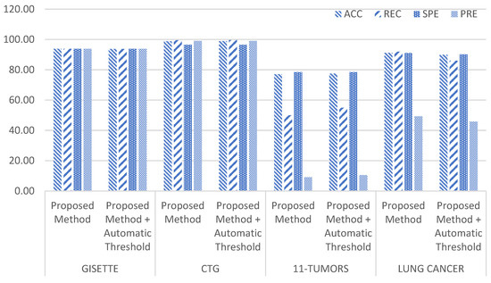 In this section, we describe some of the results obtained. We evaluated the proposed method based on several criteria. First, the overall performance was judged based on the values of accuracy, recall, specificity, precision, F1-score, and the number of features selected. In this evaluation, we compared the proposed method with previous two-dimensional (2D) ensemble methods and the standard ReliefF. The most important thing from feature selection is knowing which features/subsets of features are relevant. By using a combination method to combine subsets of features and obtain features that produce the smallest loss, we could deduce which subset of features was the most relevant. The next evaluation approach involved measuring the stability of the proposed method. The last evaluation approach involved looking at the effect of the automatic threshold on the proposed method.