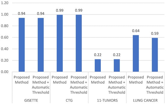 We also applied an automatic threshold to the proposed method. The automatic threshold used was the mean of the ranking weight. Figure 7 and Figure 8 show the results of a comparison between the proposed method without an automatic threshold and that using the automatic threshold. The result was not significant; in some cases, the results with an automatic threshold surpassed those without an automatic threshold, and vice versa.
