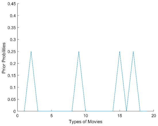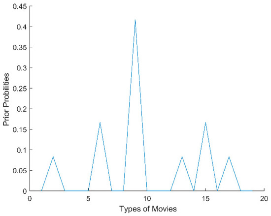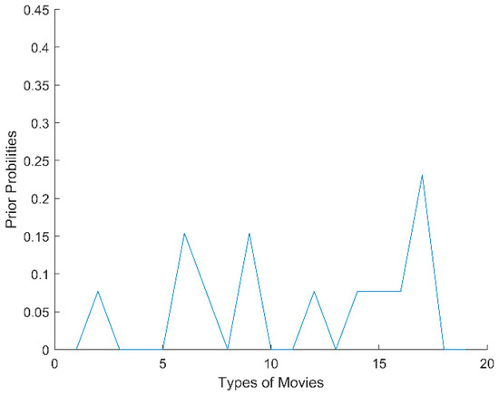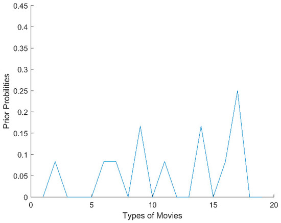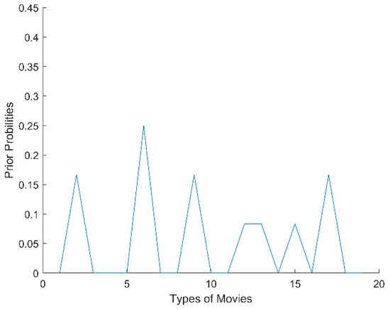 Of these values, Tij indicates the timestamp that the i-th user rated the j-th item, and 0 indicates that the user did not rate the corresponding item. We then ranked the timestamps in descending order, divided the non-zero timestamps into K time windows, and calculated the prior probability of item types within each time window. For example, indicates the prior probability of type a within time window T1; similarly, indicates the prior probability of type b within T1. In our experiments, we randomly selected a time-sensitive user i from the 100K MovieLens dataset and computed the probability distribution of different types that the user watched in five time windows. As shown in Figure 1, Figure 2, Figure 3, Figure 4 and Figure 5, the x-axis represents the types of movies (there are 19 types of movies in the dataset), and the y-axis represents the prior probability of each type in the time window, where its value ranges from 0 to 1.