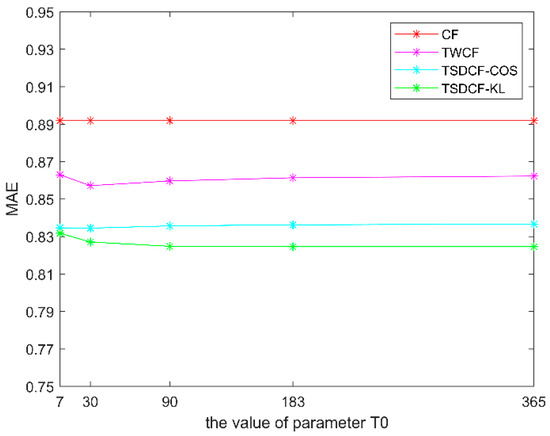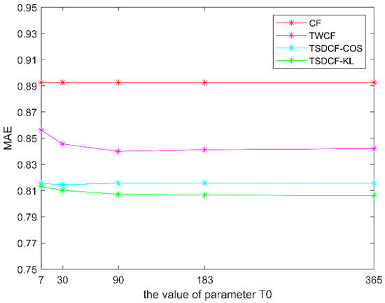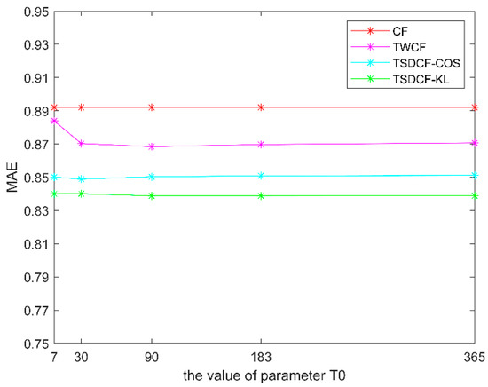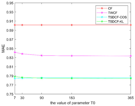 TSDCF-COS represents the result of the proposed algorithm with cosine distance, while TSDCF-KL represents the result with relative entropy. From Figure 6, Figure 7, Figure 8 and Figure 9, we can see that with different numbers of neighbors, the MAEs of the three algorithms that took into consideration the influence of time context are lower than those of the traditional CF algorithm. Moreover, the results of the proposed algorithm are better than the TWCF algorithm, which does not take into consideration the time-sensitivity of users. When the values of N and T0 are the same, the prediction error of using relative entropy to measure users’ time sensitivities is slightly smaller than that of using cosine distance. In other words, with the same parameters, the MAE of TSDCF-KL is generally smaller than that of TSDCF-COS. Accordingly, it can be taken that TSDCF-KL is superior to TSDCF-COS. In addition, the MAE will increase with the increase of N, which may be caused by the low similarity between items when N exceeds a certain value or put another way if the number of neighbors is too large, the similarity noise will increase.