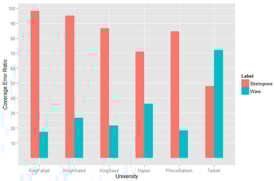 The bar plots of the CER scores computed for all the university homepages are shown in Figure 3. It is apparent from Figure 3 that SiteImprove outperformed Wave in five homepages. However, Wave detected more accessibility errors than SiteImprove in the Taibah University homepage. This is due to the fact that the Wave checker detected ten empty links, and these were not discovered by SiteImprove.