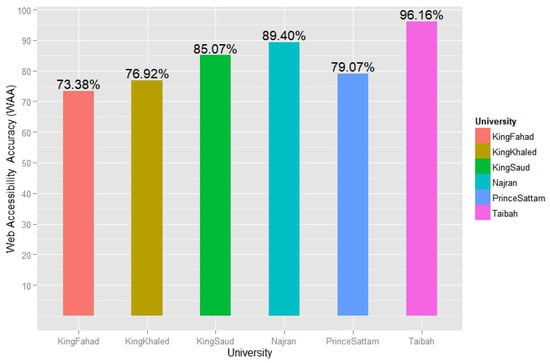 The bar plots illustrated in Figure 4 summarize the WAA scores attained for each homepage. From this figure, it is obvious that the homepage of Taibah University is more accessible than other homepages as its WAA score is 96.16%, which is the highest score. This means that the homepage of Taibah University violates fewer guidelines in WCAG 2.0 than other homepages. This is an interesting outcome as Taibah University was classified in Yesser in the red (poor) category in providing e-services. This indicates that the IT center is aware of WCAG 2.0. Conversely, the homepages of Prince Sattam University and King Saud University attained lower WAA scores than Taibah University even though they belong to the green (excellent) category in Yesser.