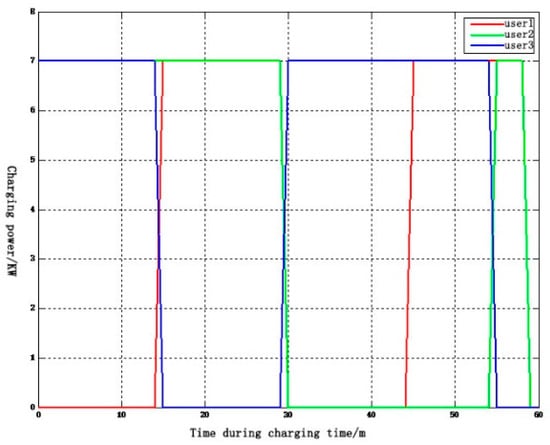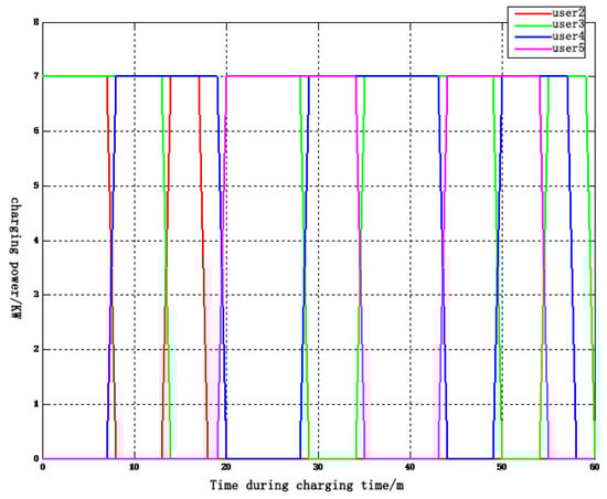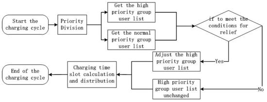 | Step1: Import parameters and initialize the algorithm; Step2: Based on the given Formulas (1)–(5), the high-priority group and the ordinary priority group are determined; Step3: According to the two conditions, the bidding supplier can be judged. Condition 1: There are vehicles leaving in the middle of the charging cycle, and the charging resources are free. Conditions 2: The users of unloaded vehicles bid high to compete for charging resources; Step4: It is judged whether there is a bidding user; the number of spare charging slots is calculated, and the bidding user is replenished to the charging stage according to different conditions; Step5: Calculate the total amount of available charging resources. The allocation method is calculated according to Formula (8) for all users in the priority queue according to the charging requirements of each user. |