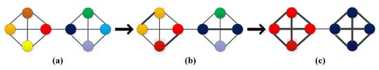 A simple network with eight nodes can be represented in Figure 1. The color of the nodes represents the information carried by the nodes. The same color represents clustering into a community and the thicker the edges between the nodes, the better the priority between the nodes. Figure 1a displays information initialization. Each node is assigned its unique label information. At this stage, the nodes have the same degree of preference for surrounding nodes. Figure 1b shows the information dynamic interaction. Nodes continuously exchange information during the iterative process of the dynamic system. The tightness of the connection between the nodes has been changing during the dynamic iteration, and, through the introduction of the preferential decision mechanism, the system finally stabilized. Figure 1c displays uncover communities. It can be known that the preference relationship between nodes in the same community will be much larger, and the number of contact interactions will be too high. This is consistent with the definition of community in complex networks. Finally, the system achieves stable community division.