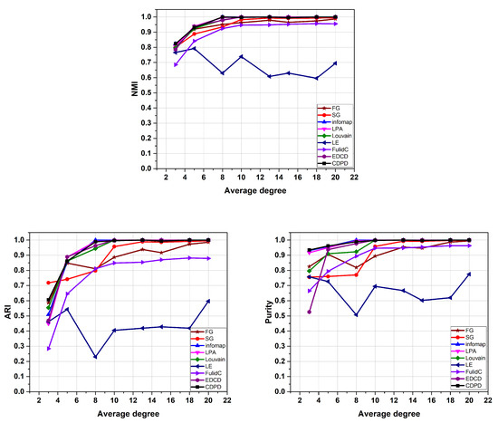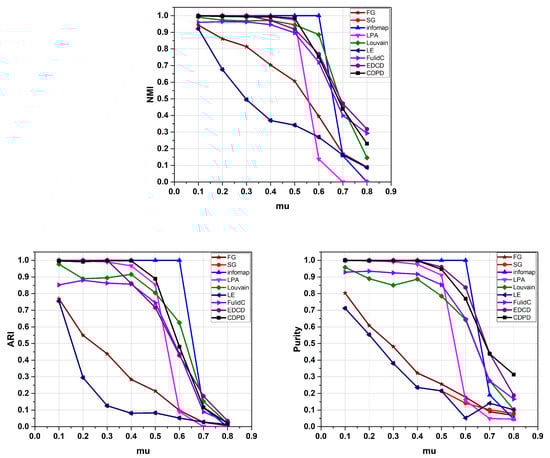 We can see that all three evaluation indicators decrease with increasing because the growth of means that the community structure is increasingly blurred. In Figure 2, when is less than or equal to , CDPD always maintains optimal performance when compared with other algorithms. When is equal to , the performance of CDPD is second only to Infomap. We can see that Infomap always performs well with ranging from to . However, when equals , the performance of Infomap decays rapidly; although the performance of CDPD has also weakened, it is still relatively superior.
