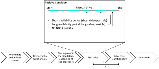 Participants were welcomed and informed about the study and the procedure. After risks such as nausea and the option of withdrawing from the study without needing to cite reasons were outlined, written consent was obtained. Participants filled out a demographic questionnaire, which also asked for details of their experience with driver-assistance and automation systems. They then drove in the driving simulator for about 10 min to get used to the simulation environment. Test persons learned how to use the automated driving function, i.e., activating it and taking back control. Furthermore, they learned how to interact with the tablet computer in the middle console representing the Central Information Display (CID). They were taught how to activate and deactivate videos, which represented the NDRAs during this study. Participants experienced several RtIs to reduce surprise effects that might emerge from this system interaction, as reactions to RtIs were not subject of this investigation. Subsequently, the participants conducted the test drives experiencing the three concepts and were interrupted by filling out questionnaires on the system. The order of the test drives and thus the concepts was randomized to avoid learning effects influencing the results of the study. Each test drive took about 15 min and, independent of the condition participants were assigned to, they experienced six availability durations in every test drive. In the positive condition, four of those availability durations were long enough to finish a video, while in the negative condition, only two availability periods were long enough to complete an NDRA. The videos were categorized as long and short videos. Long videos took about 90 s, while short videos took about 50 s. The activation of the videos was carried out by double tapping. The videos were structured on the screen according to the category they were assigned to (short vs. long). Hence, short videos were fixed on the left side of the screen and long videos on the right side of the screen. A sign above the tablet showed which side indicated which video category. The availability durations were defined to be either long enough for a short or a long video or not long enough for either. In the positive condition, the availability durations consisted of two periods long enough for a long video and two long enough for a short video. In the negative condition, one availability was long enough for a long video and one was long enough for a short video. Test persons were instructed to watch as many videos as possible while driving automatically without being interrupted. They were not instructed to only activate when the availability duration was long enough to watch a video, and no instructions were given on activating every time automation was available. Hence, it was their own decision whether to activate or not. To ensure participants adhered to the planned study design and did not pause and continue videos, they were told that an intentional interruption of a video—or starting one when it was clear that it could not be finished—was considered to be contrary to the rules. To avoid learning effects concerning the order of the availability periods and their lengths, the order was randomized. Figure 3 shows the procedure and an exemplary test drive with its availability durations.