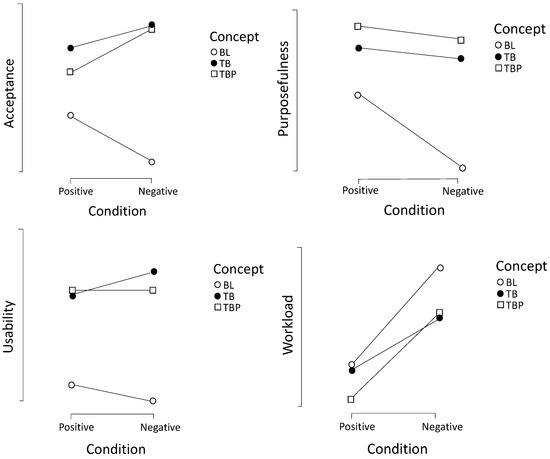 Interaction diagrams for acceptance, usability, workload, and purposefulness of activation behavior.