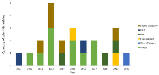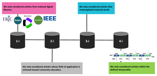 Table 2 lists 27,289 articles that were considered to be “relevant”. These articles were narrowed down by temporality (2007–2020), leaving 1648 “pre-candidate” articles. Pre-candidate articles were then exported to Excel according to Database characteristics, reducing the articles to 69 “candidate” articles. We proceeded to exclude articles whose titles had no relation to the object of study; we excluded duplicate articles and articles that did not refer to maturity levels from the seven Databases, to identify the final “selected” articles: 10 from Scopus, 1 from Web of Science, 2 from ScienceDirect, 3 from IEEE, 2 from ERIC, 5 from EBSCO Discovery and 0 from Wiley, for a total of 23 articles that directly focused on evaluating maturity in University Education domains.