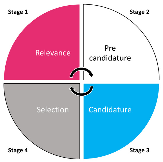 Maturity model selection procedure: (a) Stage 1—Execution of search string in the selected Databases; (b) Stage 2—Those who met conditions 1-i, 2-i and 4-i were considered pre-candidates. The resulting articles were exported to Excel for further refinement; (c) Stage 3—The articles were analyzed based on two conditions: 2-e, 3-e; (d) Stage 4—Articles were analyzed based on two conditions (3-i and 1-e), implying a review of the abstract and conclusions of all articles contemplated in stage 3.