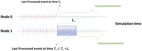 A fundamental paradigm in simulation is discrete-event simulation (DES) []. DES is characteristically involved with the modeling simulation of systems as a succession of events in a discrete fashion. These events arise at specific times and have the potential to change the state of the system. The execution of a single DES program on parallel and distributed computational systems is called parallel and distributed discrete-event simulation (PDDES) []. These systems can have characteristics from the high-performance computing systems and the hardware multi-threaded systems. These systems include schemes that communicate through shared memory modules. They also can include a more loosely coupled system where each processor has its local memory and a communication scheme based on messages. In addition, new initiatives, especially on platforms such as cloud-based virtualized arrangements and Internet-scale settings, can make PDDES more viable, easy to use, and cost-effective [,,,,,,,,,].