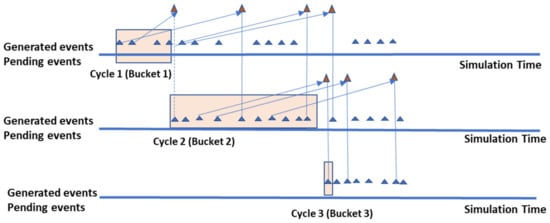 The concept of the event horizon is essential in BTB [,,,]. The event horizon is defined as the specific time where events created turn back. All new events created at the last bucket are organized and combined into the event queue at the event horizon (Figure 3). This process is fundamental to exploit. The calculation of the global event horizon is essential to avoid problems with other SOs. The nodes are prepared to synchronize when they have executed events up to their local event horizon. Next, we can calculate GVT as the minimum local event horizon from all the nodes and commit events with timestamps less than or equal to GVT.