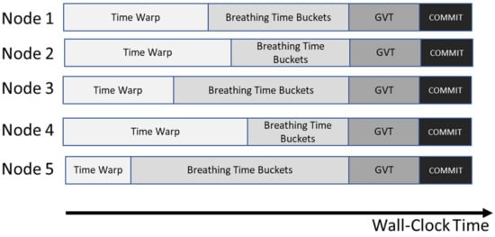Example of the breathing time warp (BTW) event-processing cycle with a TW phase, a breathing time buckets (BTB) phase, computing of global virtual time (GVT), and the corresponding commitment of events in five nodes.