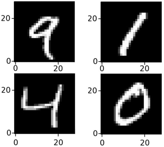 The validation of the DBN software was built using MATLAB and was performed using standard benchmark pattern classification data from the MNIST handwritten digits database [,]. The MNIST database of handwritten digits has a training set of 60,000 examples and a test set of 10,000 examples. The digits were normalized in size and centered on a 28 × 28-pixel size image (Figure 5). The MNIST handwritten digits database has become a good database for researchers who want to test software that implements artificial intelligence algorithms on real-world data while spending minimal effort on pre-processing and formatting. Several architectures were developed using a different number of layers and neurons. The performance in the testing set achieved was more significant than 98% accuracy, which corresponds with the values reported by other researchers []. The software was also validated by sharing the source code and the results with the MNIST database with the research group of the creator of DBNs (Geoffrey Hinton) at the University of Toronto.