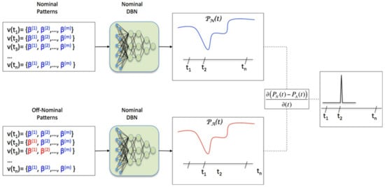 The method devised for anomaly detection examines the difference between two DBN output probabilities. The output probability of a DBN in reaction to its own nominally trained telemetry signal set is compared with the output probability of the same DBN in reaction to its own nominally trained data set, but with a small change. This method allows for the use of a DBN to detect slight changes in telemetry signals. Figure 6 shows the detection process.
