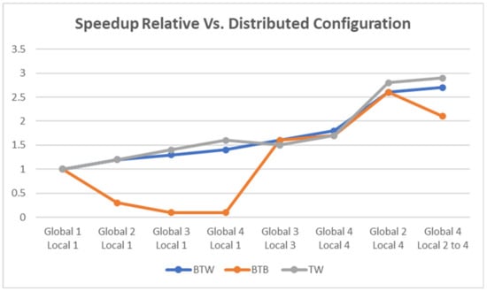 The performance criterion is the minimum wall-clock time, and this indicates the synchronization scheme with the best level of speedup achieved. The wall-clock time tells us the time it takes for the computer system to finish the simulation. It is the time to the solution: the number of seconds of wall-clock time to satisfy the termination criterion of detecting the aircraft in this case. Many research initiatives have used speedup and its relationship with the wall-clock time as a performance measure [,,,]. Table 5 indicates the training vector for the case study of Figure 7, with four global nodes and one local node using block as the distribution policy, with TW as the best performance (best wall-clock time). It is essential to say that if this case study is implemented using three global nodes and three local nodes using block as the distribution policy, then BTB is the synchronization scheme with the best performance (minimum wall-clock time).