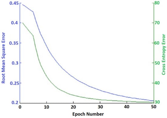 Root mean square error and cross-entropy error—training curve for the DBN developed with 21 inputs, 50 neurons in the first hidden layer, 50 neurons in the second hidden layer, 50 neurons in the third hidden layer, and 3 output neurons.