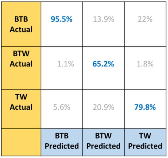 This DBN has the testing performance that is shown in Figure 15. Preliminary datasets were utilized with the multi-layer perceptron (backpropagation) []; however, the performance obtained was lower than 60%.