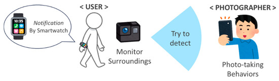 In the latter group, the photographed person proactively takes actions to protect his privacy. For examples, Yamada et al. [22] proposed a method to avoid unintended appearance in photos physically using a privacy visor that uses near-infrared light. That privacy visor’s shape is like a pair of glasses that are equipped with near-infrared LEDs. The purpose of the use of near-infrared light is to saturate the charged-coupled device (CCD) sensor of digital cameras to distort the Haar-like features. Farinella et al. developed FacePET [23] to prevent the unintentional capture of facial images by distorting the region containing the face. This work is similar to the work in [22] since it makes use of glasses to emit light patterns designed to distort the Haar-like features which are used in some face detection algorithms. The noticeable difference is that the work in [22] used near-infrared light, while the visible light was used in [23]. However, these systems might not be effective for other types of face detection algorithm such as deep learning-based approaches. Additionally, these prototype glasses seem to be burdensome for users. In previous study [24], we proposed a method to identify photo-taking behavior using optical flow technique. To recognize such the behavior, the movements of arms and/or hands of the photographer were studied. However, the detection accuracy of this proposal was not so high, and it focused on only photo-taking behavior without considering other behavior with similar characteristics.