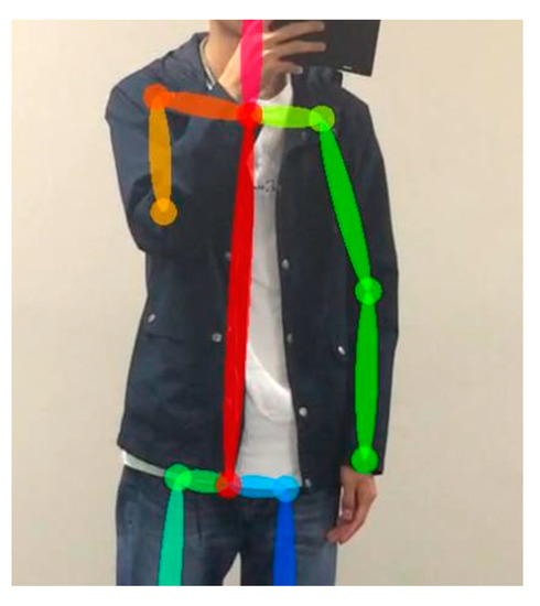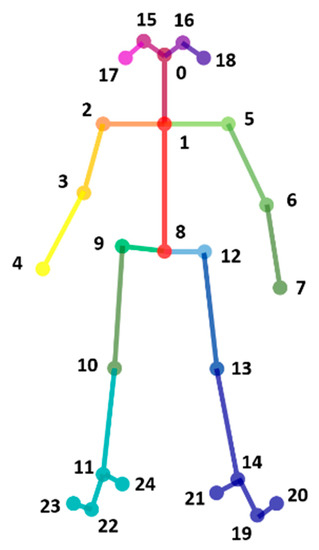 In order to obtain the skeleton information, OpenPose [17] (an open-source tool) is used. By leveraging this tool, the human skeleton information can be extracted in real-time from two-dimensional video frames. Figure 2 illustrates an example of skeleton information extracted from OpenPose. Accordingly, there are 25 points connected by joint parts, establishing “BODY_25” human skeleton estimation model. In practice, OpenPose allows the joint coordinates in each frame to be obtained and stored in json files. Thus, the skeleton data is formed as [x, y, confidence score].