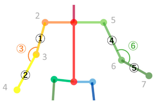Here, the x and y are coordinates indicating body part locations in the input image. The confidence score indicates the accuracy of the coordinates calculated by OpenPose tool. As we assumed earlier, there are some potential differences in the arm’s length and the angle among photo-taking and net-surfing behaviors. Therefore, we only focus on these parts which are numerically calculated from joints’ information. Accordingly, the joints: “2, 3, 4, 5, 6, 7” in “BODY_25” model (depicted in Figure 2) are used for further behavior analysis. The points and joints of the utilized arm parts are visualized in Figure 3. Table 1 provides brief information of joint positions of the arm parts and the according expressions used in this paper.