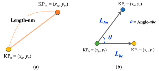 In proposed approach, the numerical values of the arm length and angle are determined by using the distance between two points and inner product of coordinates, which are obtained from OpenPose. The detailed calculations are presented in Figure 4.
