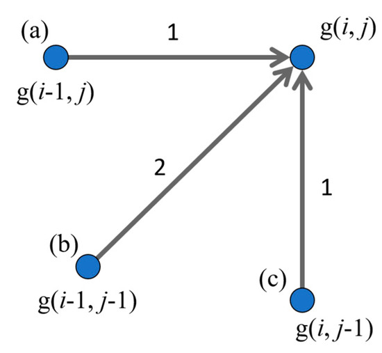 In addition, the accumulated distance is expressed by g(i, j) in i-j coordinates space. g(i, j) basically can be obtained by calculating the minimum DP path in an optimal distance problem. Figure 5 shows the weight for calculating optimal distance as the definition of DP path. According to Figure 5, the dissimilarity g(i, j) can be defined by