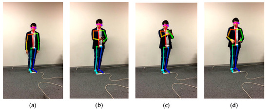 Visual skeleton information of photo-taking behavior extracted from OpenPose. (a) Initial position of subject’s arm; (b) before subject start taking photo; (c) when subject is taking photo (during photo-taking behavior); (d) when subject finishes photo-taking behavior.