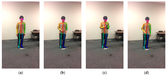 Figure 8 and Figure 9 partly illustrate the visual outputs obtained from OpenPose for photo-taking and net-surfing behaviors, respectively. Specifically, (a–d) in these two figures shows the example frame expressing: initial position of subject’s arms, moment when the behavior starts, moment during the behavior, and moment when behavior ends, respectively. The OpenPose data obtained from the participant who performed a photo-taking behavior was denoted as “”. Meanwhile, the data obtained from the participant who performed net-surfing behavior was denoted as “”. We divided the obtained dataset into two sub-datasets, namely, dataset1 and dataset2 with the ratio of 50:50. The details are tabulated in Table 2. Accordingly, the dataset1 which consists of to and to was used for determining DP threshold. Note that, since this sub-dataset was small, cross-validation was applied beforehand. On the other hand, the dataset2 which consists of P8 to P15 and N4 to N6 was used for evaluating the performance of the proposed approach.