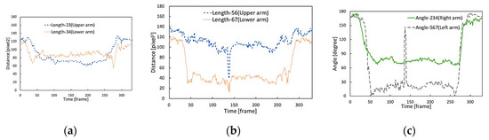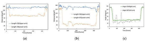 Arm’s length and angle of bending arms of subject 1 when taking photo. (a) Right upper and right lower arm’s lengths; (b) left upper and left lower arm’s lengths; (c) angles of right bending and left bending arms. In (a,b), vertical axis represents distance between joints (length) in pixel2. The horizontal axis indicates frame number it means time (in frames). In (c), the vertical axis represent angle in degree. The horizontal axis indicates frame number it means time (in frames).