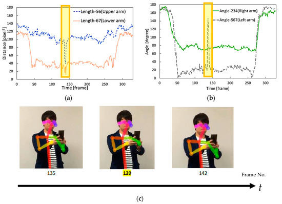 Example 1 of misdetection generated by OpenPose (taken from P1). (a) Left upper and left lower arm’s lengths; (b) angles of right bending and left bending arms; (c) Example frame (135th, 139th, and 142nd).