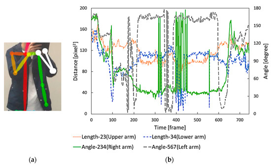 Example 2 of misdetection generated by OpenPose (taken from P5). (a) Misdetection frame (white line presents an expected detection result); (b) result of the right upper and lower arms’ lengths and the angle of right/left bending arms. In (b), first vertical axis indicates distance between joints (length) (pixel2). Second vertical axis indicates angle (degree). Horizontal axis indicates frame number corresponding to time (frames).