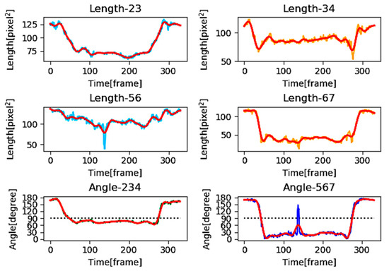 Figure 14 shows another example of misdetection (Example 2). In Figure 14a, the ideal detection result is drawn in white color. According to this figure, the result obtained from OpenPose was different from the ideally estimated result. Figure 14b shows some numerical values calculated from the coordinates of joints of the subject. The values fluctuate several times due to such a misdetection. In fact, both non-detection and misdetection create noise in the obtained data. Thus, in order to remove the noise, low pass filter (LPF) was used. Thereby, we first extracted the frequency components from the obtained data by using fast Fourier transform (FFT), then the cut-off frequency was assigned. In this case, a general Butterworth filter was considered as the filter, whereas the desirable cut-off frequency of the LPF was determined as 40 Hz from the preliminary experiment. Figure 15 visualizes the processed photo-taking behavior data of subject 1, after performing LPF. Vertical axes indicate the am length in pixel2 and the angle in degrees. The horizontal axis indicates the frame corresponding to time. The line in red in each graph indicates the result of the filtering. Qualitatively, it is obvious that the transitions of joint components become smoother, allowing us to apply data to further analysis steps.