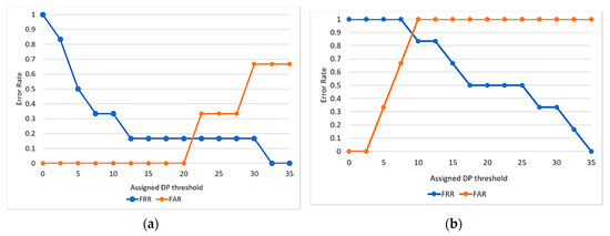 Examples of FRR–FAR curves in the cases where: (a) reference data is P1; (b) reference data is P6. In each graph, the horizontal axis indicates assigned DP thresholds. The vertical axis indicates error rate.