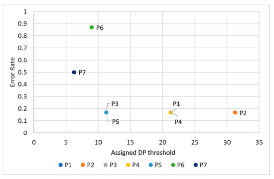 The calculated FAR and FRR were plotted along with the so-called ‘assigned DP threshold’ which was ranged from 0 to 35 with an increasing step of 2.5. If the DP score of each joint component in the reference data of particular participant (as an example of P1 in Table 3) is less than ‘assigned DP threshold’, it is determined that this participant performed a photo-taking behavior. Oppositely, a net-surfing behavior was determined when the DP score is more than ‘assigned DP threshold’. Similarly, with the data of seven participants who performed photo-taking behavior, we could obtain seven graphs depicting the visual values of FAR and FRR of these participants. Figure 17 depicts two of seven graphs of the reference data P1 and P6. Thereby, seven values of EER were easily extracted. As mentioned earlier, EER is the intersection point of FAR and FRR where both of those values are equal. To determine DP threshold, a general value of EER across all the participants must be obtained. Figure 18 depicts all of seven EER values. Accordingly, most of EER values which are less than 0.2 represent photo-taking behavior. On the other hand, the data with an obviously high error rate was recognized as outliers and must be removed. Thereby, we excluded two data points: and with EER values higher than 0.4. The average value of eligible EER was then calculated as about 0.17. Therefore, in accordance with the average value of 0.17 of EER, the DP threshold for our proposed approach was determined as ThDP = 15.9. In the next subsection, the performance of our approach is evaluated by using this DP threshold and dataset 2.