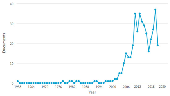 After running the search string in Table 1, a total of 550 papers were found. Then, we used SCOPUS’ own resources to evaluate this set of papers bibliometrically. Figure 1 shows that most of the publications retrieved were published after 2009. Before this year, only four documents were, in fact, related to our study. This supported the idea of refining the search for publications since 2009. The ongoing year of 2020 was also included in the search, so papers still in press were considered.