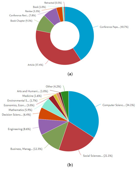 Figure 2 shows that the subject is still little explored, as the top 10 authors found have published between 2 and 5 papers. Figure 3a,b show the results by type of document and area. Newspaper articles and conference papers, in addition to papers in the areas of computer science, social science, business and management, and engineering, comprised most publications retrieved.