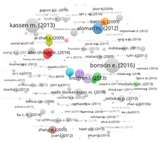 Next, the metadata generated by SCOPUS regarding the papers retrieved were evaluated by the Vosviewer Software 1.6.15. This evaluation generated the graphs presented in Figure 4 and Figure 5. Figure 4 refers to the co-citation of keywords used in the 550 papers retrieved by the search string in Table 1. Figure 5 refers to the co-citation of authors, which is a useful tool to identify the list of most cited studies, authors, keywords, etc.; therefore, it is considered to have the greatest influence on the study. In fact, the word cloud of the co-citations overlap with the frequency of authors described in Figure 2.