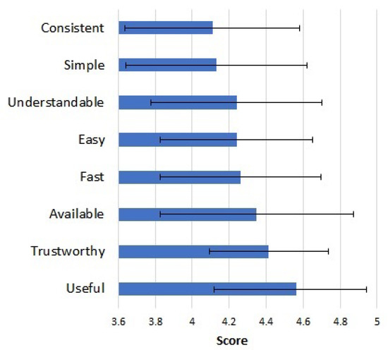 As the ‘useful’ indicator achieved the highest score, we performed a t-test to verify if there was a statistically and practical significance between the ‘useful’ indicator and all the others. Table 6 shows the paired values for each indicator compared to ‘useful’. The results do not show a statistically significant effect (p < 0.05) between ‘useful’ and ‘ease of use’, ‘useful’ and ‘trustworthy’, ‘useful’ and ‘available’, and ‘useful’ and ‘simple’. However, for the other indicators, although the t-test is statistically significant, the size of the practical effect in the difference is not significant, considering the limit of r > 0.5. Therefore, there is no statistical evidence that the ‘useful’ indicator is actually superior to the others.