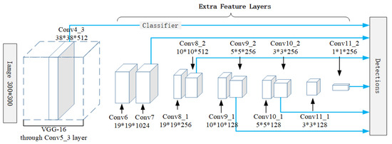 As the distance between the vehicle and the traffic sign changes constantly during driving, the size of the traffic sign captured by the camera is also constantly changing. The architecture of the baseline SSD model [25] is shown in Figure 2. The main body of the network is composed of a basic network and an additional feature network. Its biggest feature is the use of a multi-scale feature map for detection to adapt to the detection of objects of different sizes, which can meet the requirements of detecting targets of different scales during driving. Baseline SSD uses VGG-16 as the basic network, and the input is a 300 × 300 pixel image. The 5 maximum pooling layers separate the basic network VGG-16 into 6 modules, and each of the first 5 modules contains 2, 2, 3, 3, and 3 convolutional layers. The sixth module has two layers of convolution, which respectively convert the fully connected layers FC6 and FC7 of VGG-16 into 3 × 3 convolution layers Conv6 and 1 × 1 convolution layers Conv7, and also change the pooling layer pool5 from the original 2 × 2 to 3 × 3, with the step size changing from 2 to 1. Furthermore, five additional stacked convolution modules are added, each of which has 2 layers of convolution. The 6 layers of Conv4_3, Conv7, Conv8_2, Conv9_2, Conv10_2, and Conv11_2 are taken and 6 layers of feature layers with different scales are used for target classification detection and position regression.