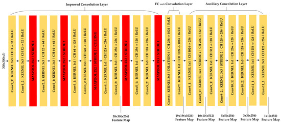 The lightweight SSD network structure proposed in this paper is based on the improvement of the baseline SSD network structure and is mainly aimed at improving the basic network structure VGG-16. Although the structure of VGG-16 is simple, the weight parameters contained in the network are relatively large, and it is difficult to adjust the parameters in the process of network training. The numbers of convolutional layers included in the first 5 parts of the network are 2, 2, 3, 3, and 3—that is, in the convolutional layers 1–13, the numbers of convolutional channels included are 64, 128, 256, 512, and 512 respectively. The size of each of the first 13 convolutional layer convolution kernels is 3 × 3, the product spans are all 1, the pooling window of the largest pooling layer is 2 × 2, and the step size is 2. The number of parameters of the baseline SSD is 22,935,232, and the number of parameters of the modified SSD is 7,036,768, and the network parameters of the baseline SSD are reduced by 3.3 times. Therefore, this paper replaces some of the 3 × 3 convolution kernels with some of the 1 × 1 convolution kernels in the baseline network to downgrade the dimensionality of the channel and delete part of the convolution layer. The improved network structure is shown in Figure 3. It shows that by reducing the number of channels and convolutional layers in the basic network part of the baseline SSD, the detection speed of the baseline SSD network model for traffic signs is improved and the real-time requirements are realized.