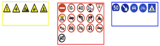 Due to the uneven distribution of the number of traffic sign image categories in the dataset, the traffic sign detection algorithm proposed in this paper only detects prohibition signs, warning signs, and mandatory signs. The main traffic signs included are shown in Figure 4. Yellow corresponds to warning signs, red corresponds to prohibition signs, and blue corresponds to mandatory signs. Due to the particularity of the main colors of the three types of traffic signs, prohibitions, warnings, and instructions, the color detection algorithm in this paper mainly focuses on yellow, red, and blue.