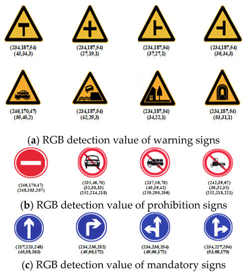 After obtaining the RGB information of warning, prohibition, and mandatory traffic signs, Equation (1) is used to convert the color space model of the image to an HSV model to summarize and analyze the main color space ranges of warning, prohibition, and mandatory traffic signs in the HSV color space. The three types of traffic signs in this paper have three main colors; according to the experimental data’s statistics, their ranges of HSV color space are shown in Table 1.